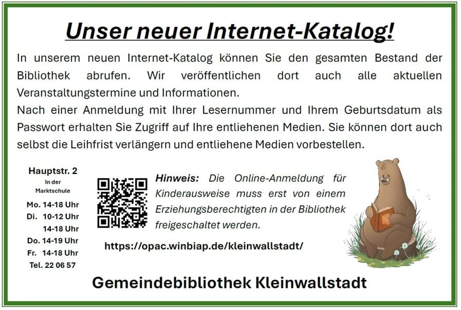 06022 2206-57 | Bibliothek | bibliothek@kleinwallstadt.de |