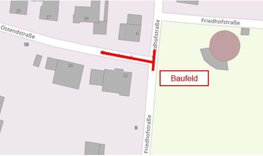 Auf Grund von unaufschiebbaren Wasserleitungsarbeiten wird die Ostendstraße ab Höhe der Hausnummer 22 bis einschließlich der Kreuzung Friedhofstraße vom 17.11.2025 bis 22.11.2025 für Fahrzeuge voll gesperrt.